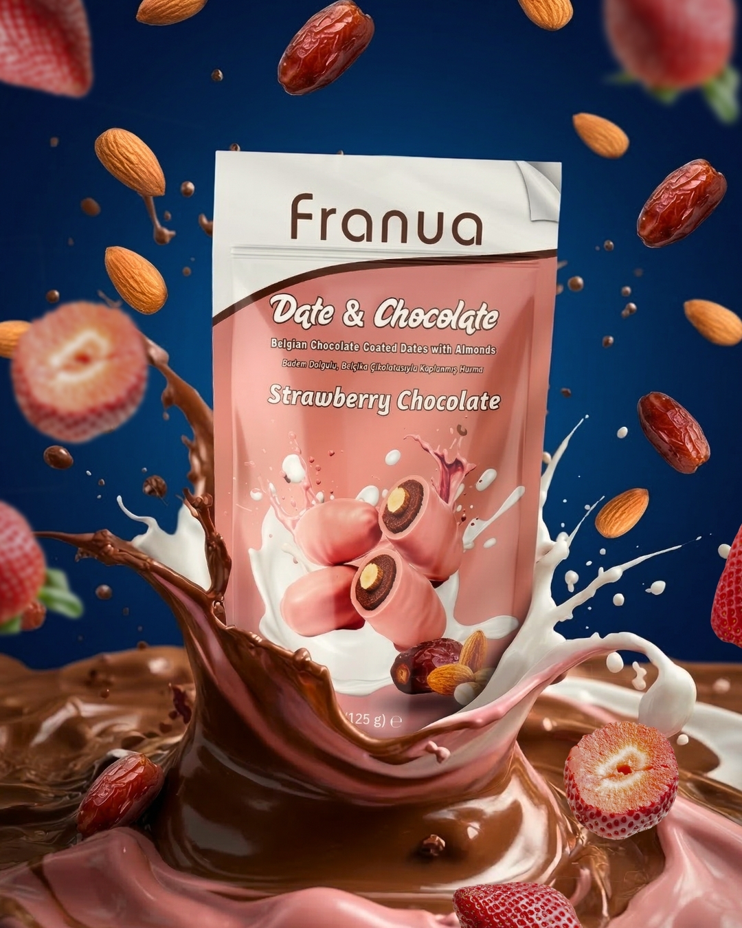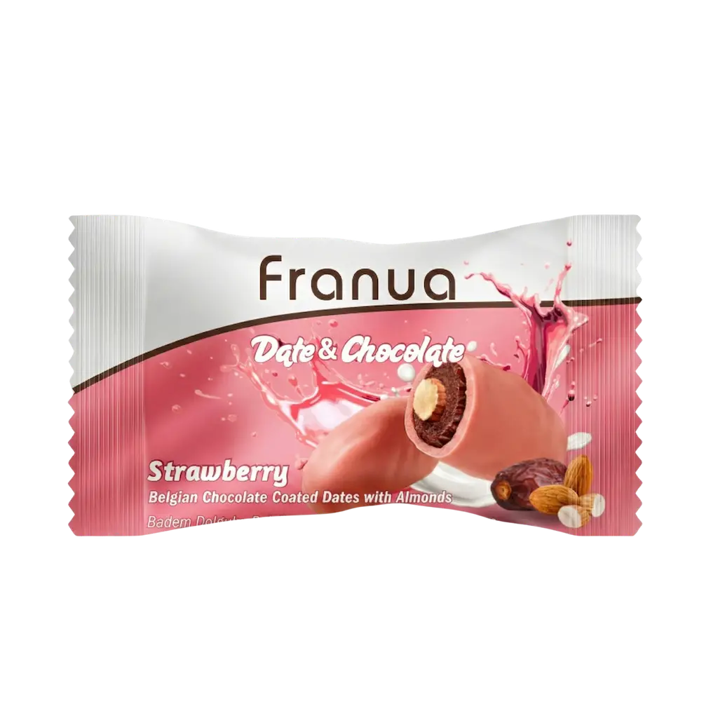 Çilekli çikolatalı hurma, hurmanın doğal tatlılığını çilek aromalı çikolatanın meyvemsi ve hafif ekşi notalarıyla buluşturan özel bir atıştırmalıktır. Franua bu üründe yalnızca bütün hurma kullanır. Her hurmanın çekirdeği çıkarılır, yerine badem yerleştirilir ve üzeri çilek aromalı çikolata ile kaplanır. Böylece hem yumuşak hem de aromatik bir tat dengesi elde edilir.